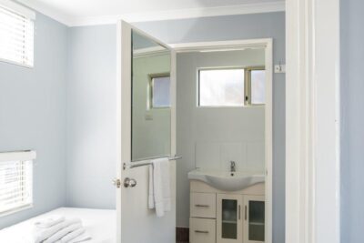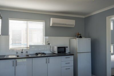 Perfect for small families or friends, this one-bedroom cabin comfortably sleeps up to four guests, featuring a queen bed and two single beds in separate areas. It includes a private bathroom, air conditioning, and a TV for added convenience. A kitchenette equipped with a microwave, toaster, kettle, and fridge provides all the essentials for a cozy stay.