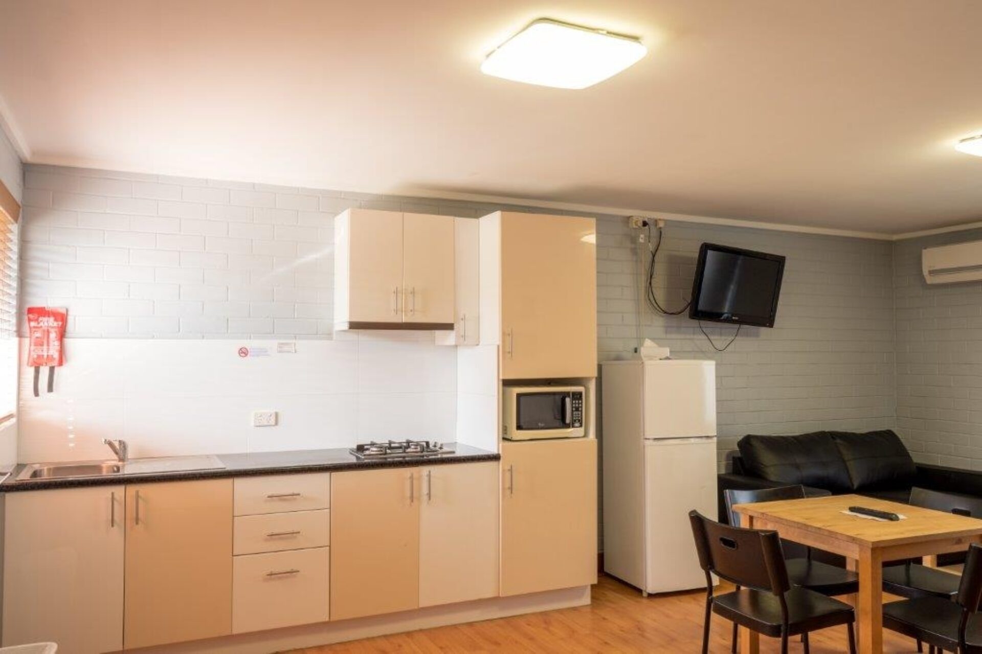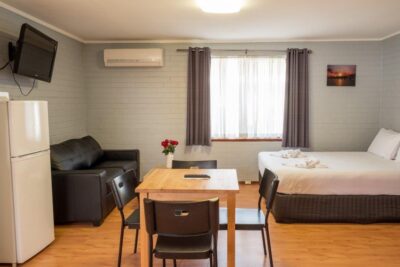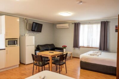 This open-plan economy studio sleeps up to four guests, featuring a queen bed, a double bed, and a sofa bed. Designed for budget-conscious travellers, it includes air conditioning, a TV, and a fully equipped kitchen with a stovetop, microwave, and fridge. Guests have access to nearby shared bathroom facilities, making it a practical choice for group stays. Please note: Two of these studio types can accommodate up to five guests, offering additional flexibility for larger groups.
