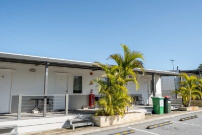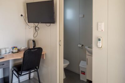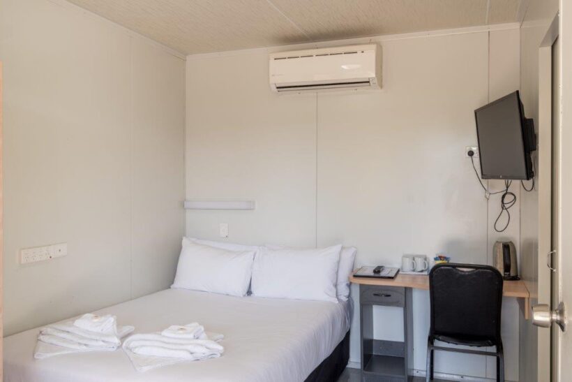 Ideal for solo travellers or couples, this compact cabin features a double bed and a private ensuite. While in-room amenities include air conditioning, a TV, and a bar fridge, guests can also enjoy the convenience of a shared kitchen located nearby. A small outdoor patio offers a relaxing spot to unwind after a day out.